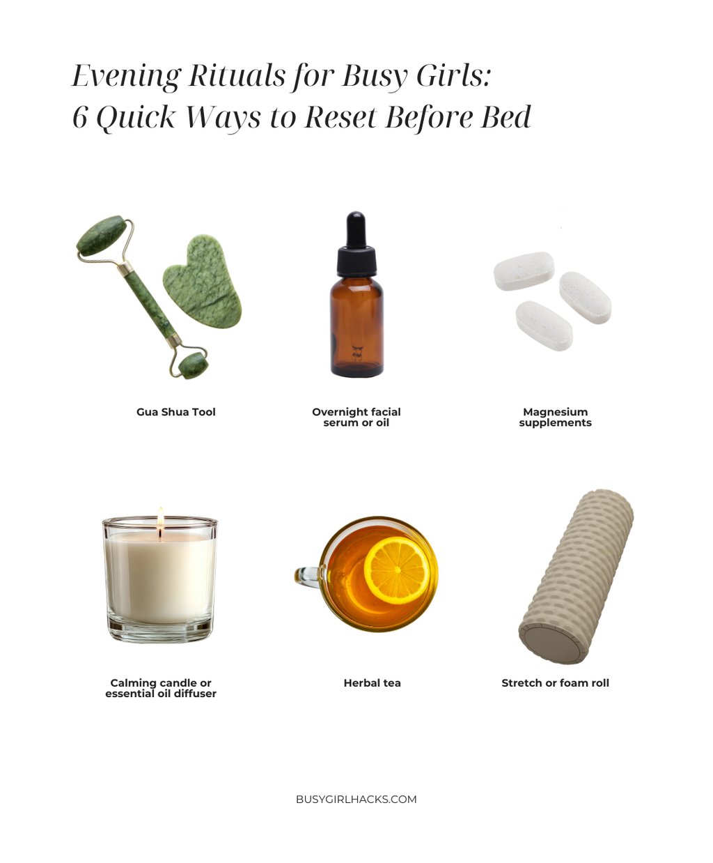 Think of these as small habits you can layer into things you’re already doing. For example, while you’re doing your skincare, take an extra minute to use a gua sha tool to gently massage your face — it helps reduce puffiness, encourages circulation, and instantly gives that glowy “well-rested” look. Another easy ritual is applying a nourishing overnight serum or facial oil before bed so your skin can repair itself while you sleep. If you want to support relaxation from the inside out, many people like to take magnesium supplements in the evening, which can help the body wind down and support better sleep quality. You can also light a calming candle or use an essential oil diffuser while you get ready for bed to signal to your brain that the day is slowing down. Another quick reset is making a calming herbal tea, like chamomile or peppermint, which instantly creates a slower evening vibe while also helping digestion and relaxation. And finally, try a five-minute stretch or foam rolling session before bed — even a few gentle stretches can release tension from sitting or being on your phone all day.